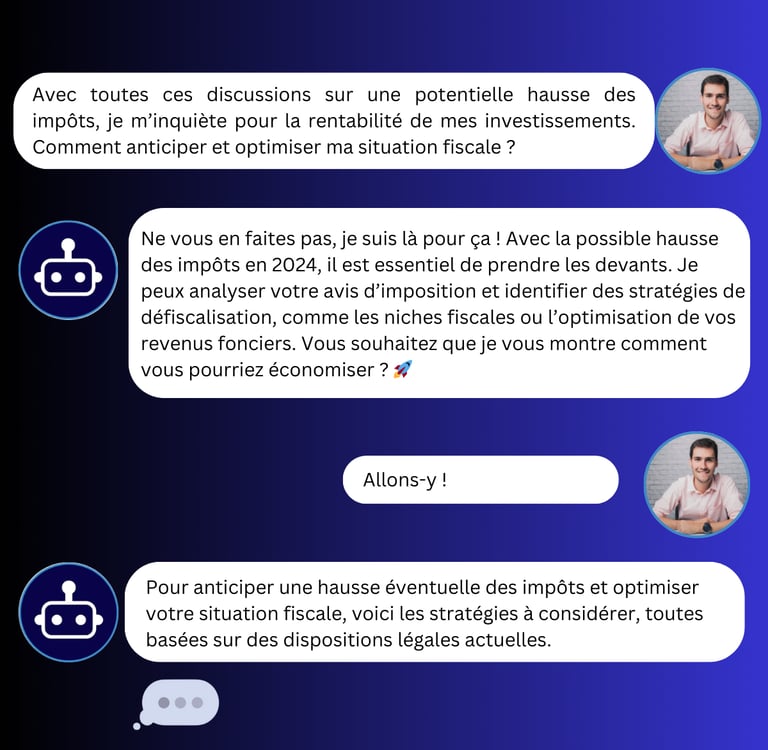 Votre assistant peut lire et analyser vos avis d’imposition pour vous fournir des conseils optimisés en fonction de votre situation et des opportunités fiscales disponibles.